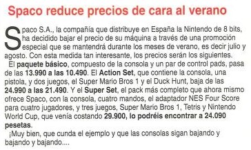 Duck Hunt, NES, NES Four Score, Nintendo World Cup, Noticias, Spaco, Super Mario Bros., Tetris Spaco reduce precios de cara al verano Fecha: 08/1992Autor/a: HCteca 0 Comentarios Comparte esto: Compartir en X (Se abre en una ventana nueva) X Compartir en Facebook (Se abre en una ventana nueva) Facebook Me gusta Cargando... Relacionado