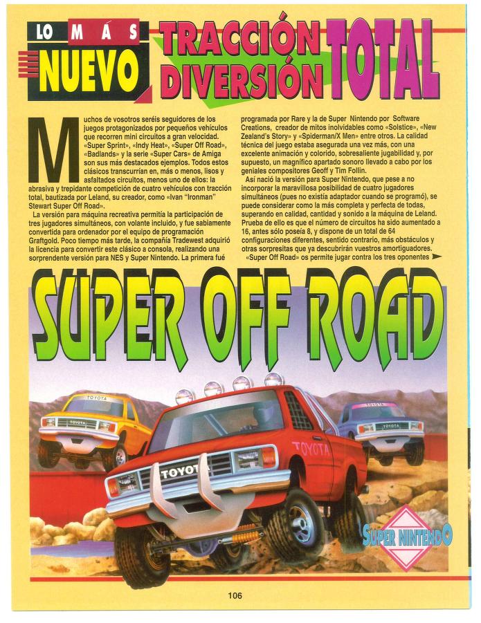Análisis, Software Creations, Super Nintendo, Super Off Road, Tradewest Tracción y diversión total [Análisis de Super Off Road] Fecha: 05/1993Autor/a: HCteca 0 Comentarios Comparte esto: Compartir en X (Se abre en una ventana nueva) X Compartir en Facebook (Se abre en una ventana nueva) Facebook Me gusta Cargando... Relacionado