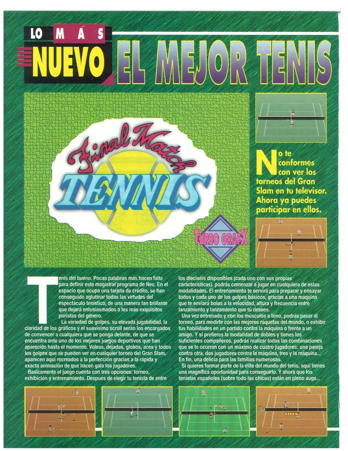 Análisis, Final Match Tennis, Human, NEC, TurboGrafx-16 El mejor tenis [Análisis de Final Match Tennis] Fecha: 06/1993Autor/a: HCteca 0 Comentarios Comparte esto: Compartir en X (Se abre en una ventana nueva) X Compartir en Facebook (Se abre en una ventana nueva) Facebook Me gusta Cargando... Relacionado