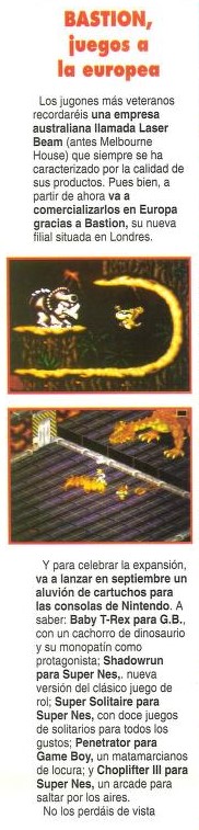 Baby T-Rex, Bastion, Choplifter III, Game Boy, Laser Beam, Noticias, Penetrator, Shadowrun, Super Nintendo, Super Solitaire