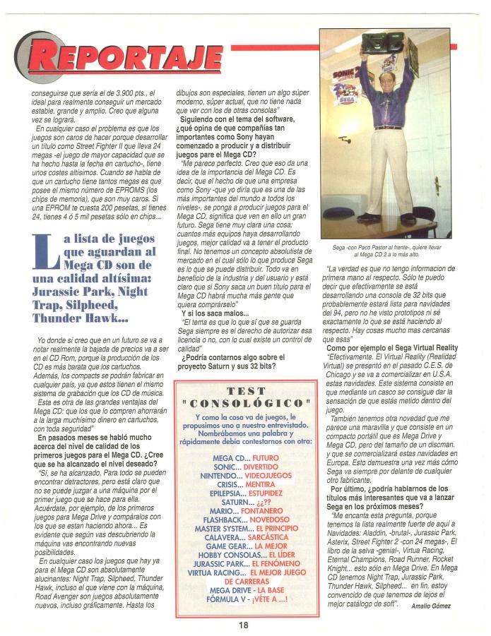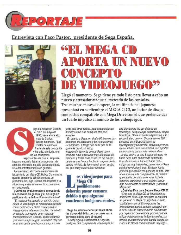 Entrevistas, Mega CD, Mega Drive, SEGA ‘El Mega CD aporta un nuevo concepto al videojuego’ [Entrevista a Paco Pastor, presidente de SEGA España] Fecha: 09/1993Autor/a: HCteca 0 Comentarios Comparte esto: Compartir en X (Se abre en una ventana nueva) X Compartir en Facebook (Se abre en una ventana nueva) Facebook Me gusta Cargando... Relacionado