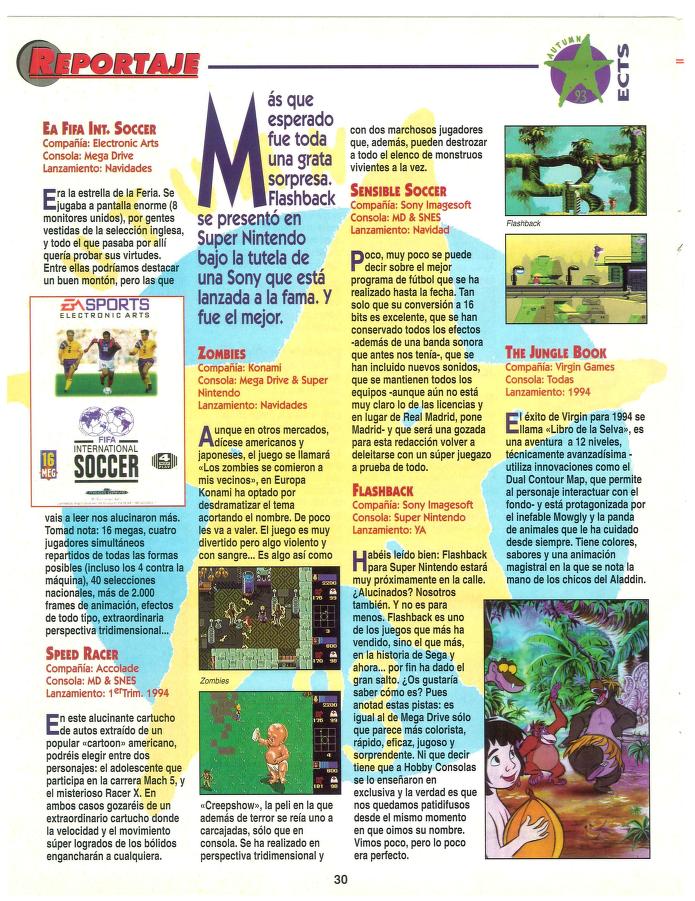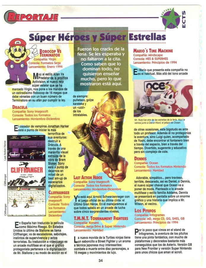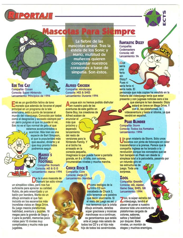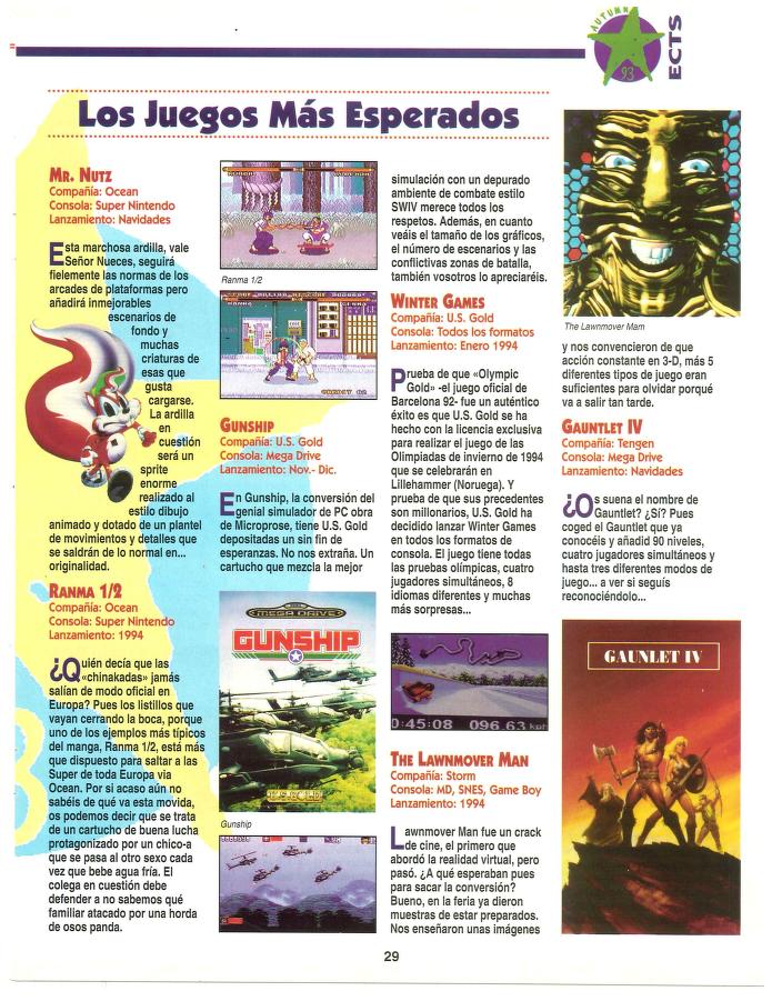 Alfred Chicken, Bram Stoker's Dracula, Chuck Rock II: Son of Chuck, Dennis, ECTS (European Computer Trade Show), Eek! The Cat, Fantastic Dizzy, FIFA International Soccer, Flashback, Gauntlet IV, Gunship, Last Action Hero, Mario's Time Machine, Marko's Magic Football, Mr. Nutz, Peaky Blinder, Ranma 1/2: Hard Battle, Reportajes, RoboCop versus The Terminator, Sensible Soccer, Speed Racer, Teenage Mutant Hero Turtles: Tournament Fighters, The Jungle Book, The Smurfs, Winter Olympics: Lillehammer '94, Zombies, Zool