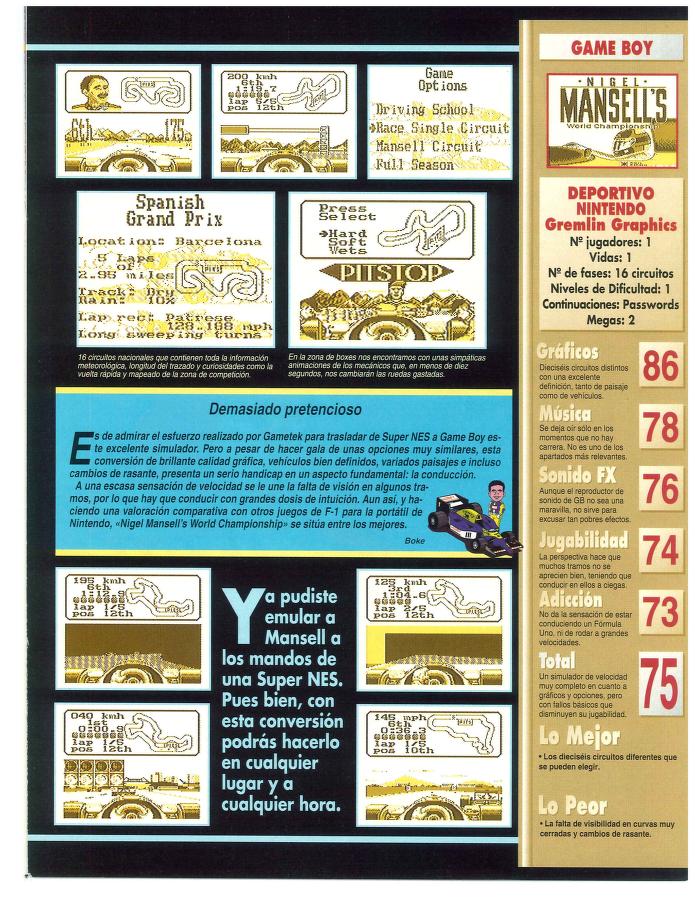 Análisis, Game Boy, Gremlin, Nigel Mansell's World Championship, Nintendo Nigel primero, el portátil [Análisis de Nigel Mansell’s World Championship] Fecha: 05/1994Autor/a: HCteca 0 Comentarios Comparte esto: Compartir en X (Se abre en una ventana nueva) X Compartir en Facebook (Se abre en una ventana nueva) Facebook Me gusta Cargando... Relacionado