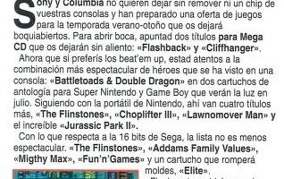 Addams Family Values, Battletoads and Double Dragon, Choplifter III, Claymates, Cliffhanger, Columbia TriStar Home Video, Eek! The Cat, Elite, Flashback, Fun 'n' Games, Game Boy, Jurassic Park Part 2: The Chaos Continues, Legend, Mega CD, Noticias, Sony, Super Nintendo, The Adventures of Mighty Max, The Flintstones, The Lawnmower Man